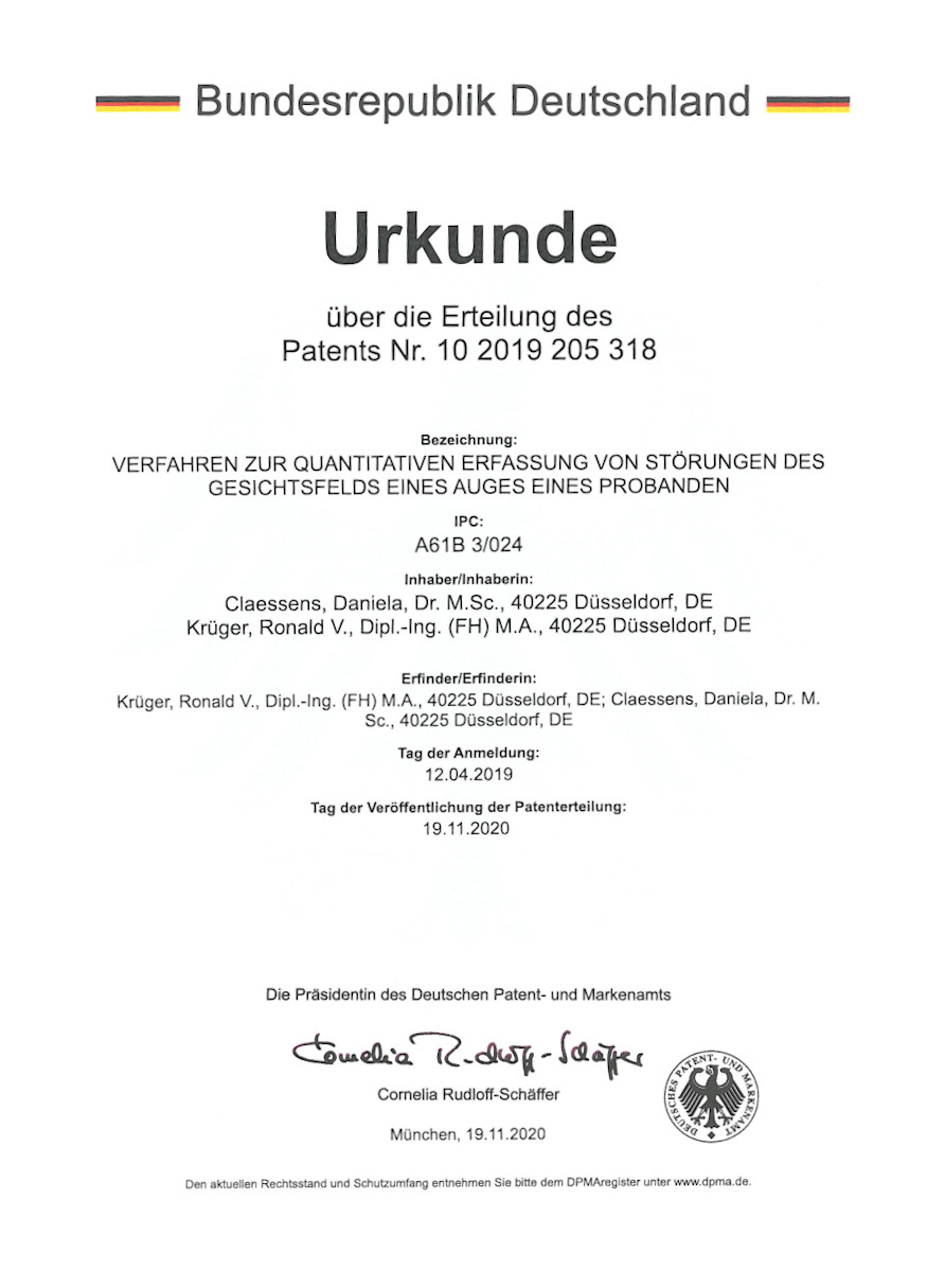 Bisher sind in der Augenheilkunde nur ein qualitatives Verfahrung zur Bestimmung der Stärke von Metamorphopsien (Verzerrungen) etabliert (Amsel-Gitter). Mit der patentierten Vorrichtungen (DE 10 2015 215 557) ist es möglich Metamorphopisen auch quantitativ zu erfassen.